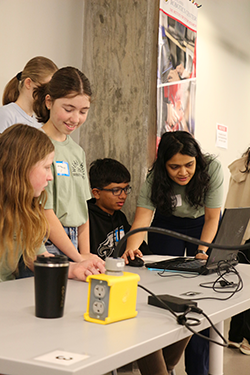 Students participate in a robotics activity during their tour of the Robotics and Autonomy Laboratory in the E.A. Fernandez IDEA Factory. Graduate student Kruti Bhingradiya (right) leads the activity, held as part of WIAA Day.The pictured students are (left to right) Katie Goodman, Natalie White, and Eshan Patel.